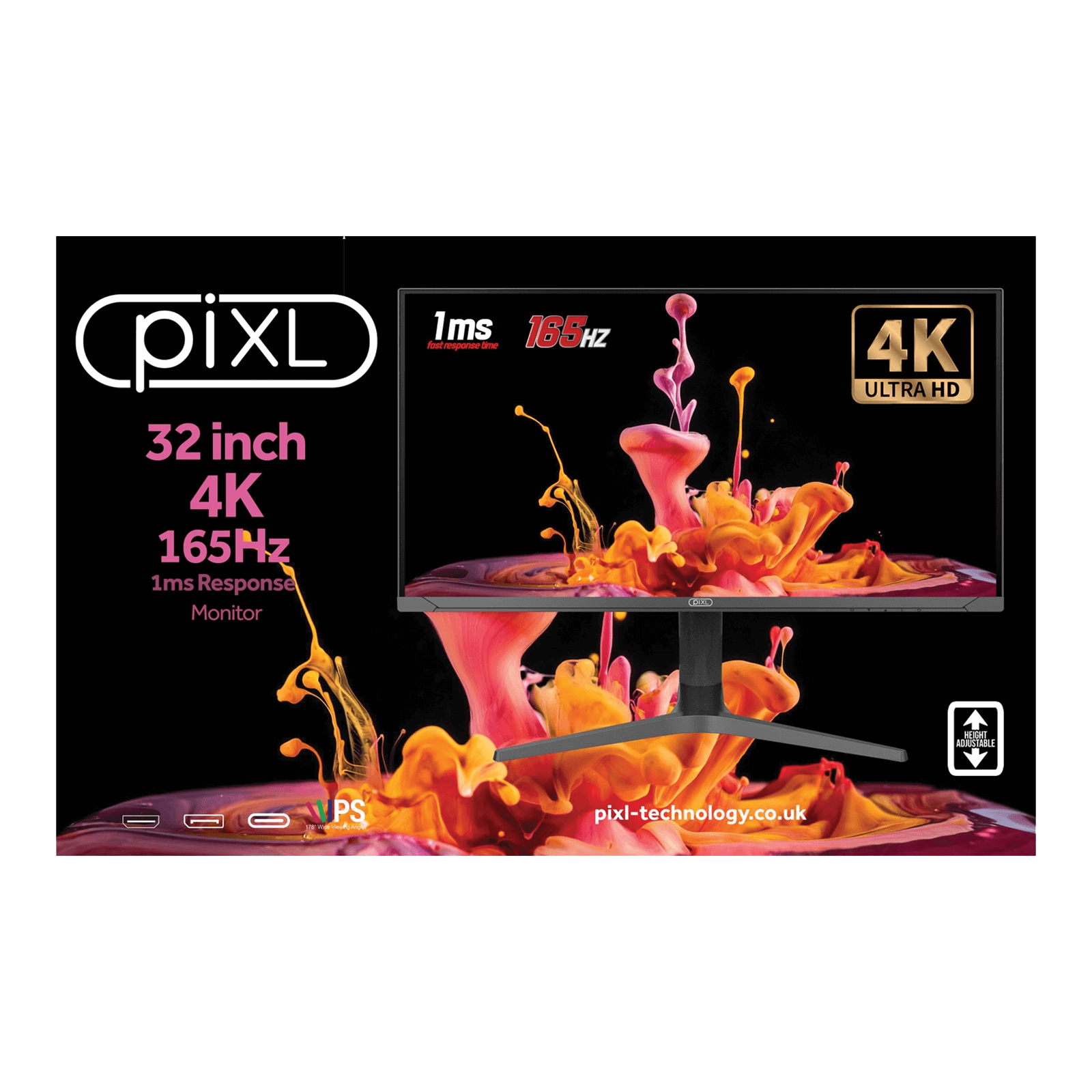 The piXL 32" CM32G7 4K monitor delivers exceptional clarity and performance with its 3840x2160 resolution and ultra-smooth 165Hz refresh rate, making it ideal for high-end gaming, content creation, and multitasking.
